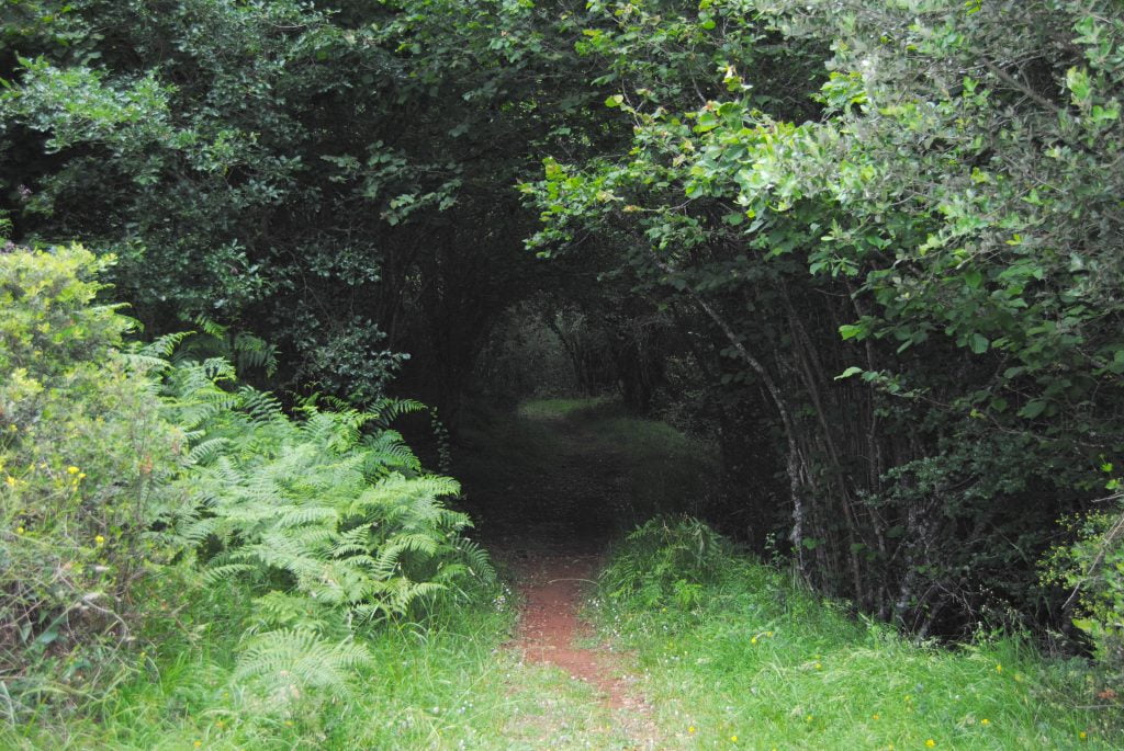 Empezamos a subir. La leve pendiente por el Camino Real de la Pola, pronto nos lleva hasta el área forestal, donde podemos observar, como a la derecha sale una senda que conduce a la casa de la central eléctrica del embalse de La Malva.
