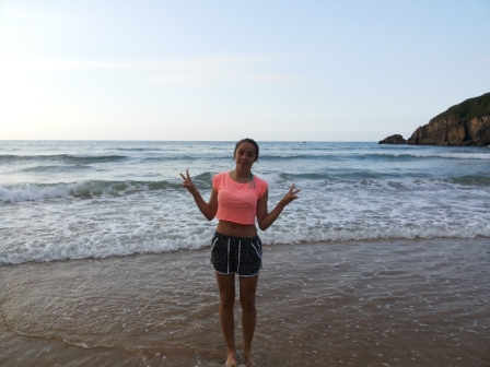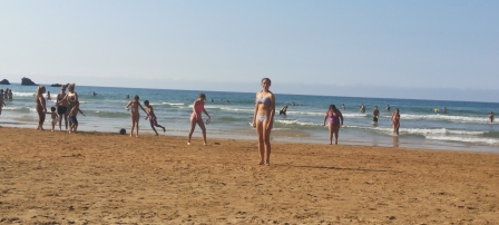 Cuando llegamos, nos encontramos con un cielo descubierto, sol, y una playa de arena fina. Carmen y Blanca no dudan en abrir el baño. Hay que andar muchos metros para llegar al agua, la marea está baja.