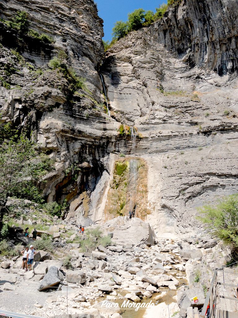 Pero antes de iniciar recorrido hacia Aínsa, hacemos parada en Broto para visitar la Cascada de Sorrosal. Una vez dejamos el coche en un aparcamiento público existente a las afueras del pueblo, iniciamos un pequeño paseo por la margen del barranco de Sorrosal, encontrándonos con el salto de agua cinco minutos después.